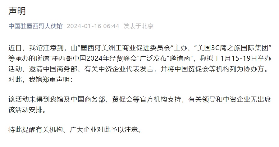 央視網(wǎng)消息:中國駐墨西哥大使館16日發(fā)布聲明稱,近日,中國駐墨西哥大使館注意到,由“墨西哥美洲工商業(yè)促進(jìn)委員會”主辦、“美國3C鷹之旅國際集團(tuán)”等承辦的所謂“墨西哥中國2024年經(jīng)貿(mào)峰會”廣泛發(fā)布“邀請函”,稱擬于1月15-19日舉辦活動,邀請中國商務(wù)部、有關(guān)中資企業(yè)代表發(fā)言,并將中國貿(mào)促會等機(jī)構(gòu)列為協(xié)辦方。