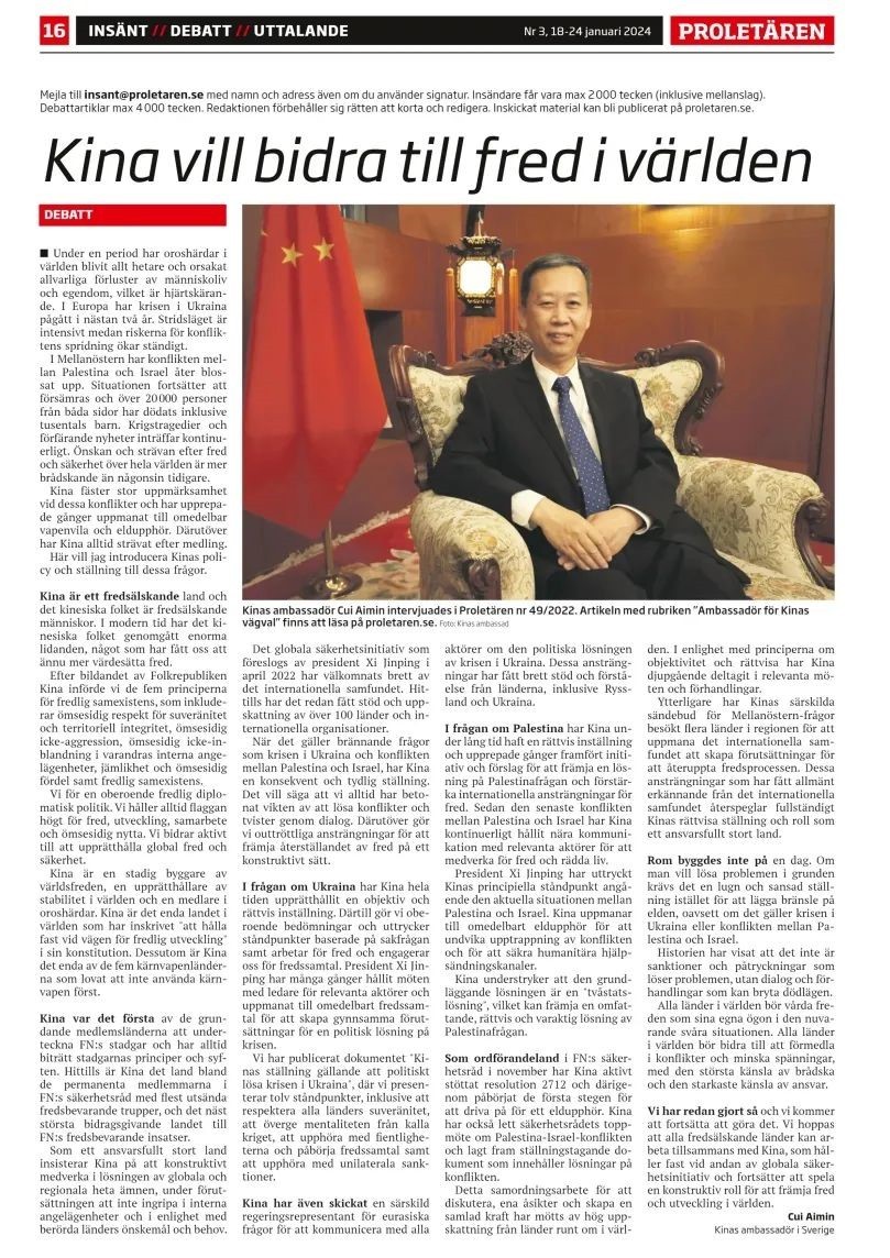 人民網(wǎng)斯德哥爾摩1月18日電 (記者殷淼)1月18日,中國駐瑞典大使崔愛民在瑞典《無產(chǎn)者報》發(fā)表題為《為世界和平發(fā)展貢獻中國力量》的署名文章,著重介紹中國在烏克蘭危機和巴以沖突等熱點問題上的政策和立場。崔愛民強調(diào)指出,“通過對話解決沖突和爭端,為恢復(fù)和平作出不懈努力,以自己的方式發(fā)揮建設(shè)性作用”是中方一貫堅持的明確立場。崔表示,希望所有愛好和平的國家同中方一道,秉持全球安全倡議精神,為促進地區(qū)和平與發(fā)展繼續(xù)發(fā)揮建設(shè)性作用。全文如下: