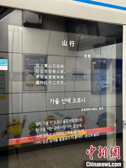 記者21日來到首爾地鐵明洞站看到,在6-1號(hào)屏蔽門兩旁的透明玻璃門上用白字印著唐代詩人杜牧的詩作《山行》,下方還印著韓文翻譯,并標(biāo)注杜牧的生卒年和國籍及譯者。