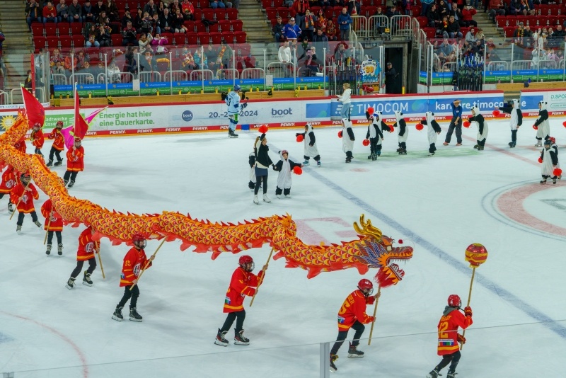 具有濃郁中國年味的節(jié)慶裝飾,滾動播放的龍年視頻及中國樂曲與激烈精彩的冰球賽相得益彰,令萬余名現(xiàn)場觀眾始終沉浸在熱烈歡快的氣氛中。領(lǐng)區(qū)華人社團及華校師生和德國民眾合作表演了充滿中國元素的“冰上唱跳MIX秀”。杜塞爾多夫功夫?qū)W校師生、德國漢園中文學校學生和杜塞爾多夫冰球隊的青少年運動員們共同完成了高難度的冰上舞龍,北威州華人藝術(shù)團演員們還帶領(lǐng)全場觀眾合唱歌曲《讓世界充滿愛》《你和我》和《幸福拍手歌(德語版)》。