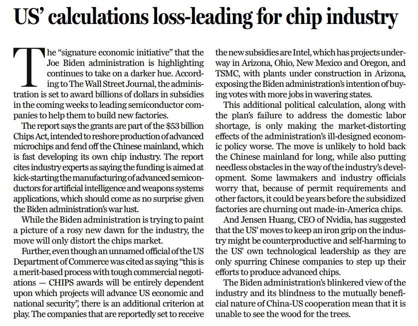 拜登政府此前出臺的《芯片法案》,可為芯片企業(yè)提供總計530億美元的補貼,用以鼓勵先進芯片制造產(chǎn)業(yè)向美國國內(nèi)回流,同時遏制正在快速發(fā)展自主半導體產(chǎn)業(yè)的中國大陸?!度A爾街日報》稱,上述建廠補貼,屬于《芯片法案》的一部分。報道還援引行業(yè)專家的觀點表示,這筆資金將為用于人工智能及武器系統(tǒng)的先進半導體的生產(chǎn)提供啟動資金,而基于拜登政府對戰(zhàn)爭的狂熱,此舉不足為奇。