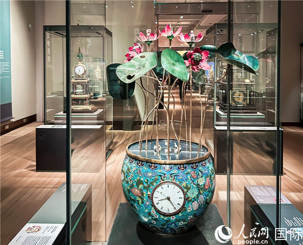 “我個(gè)人最喜歡的是銅鍍金鄉(xiāng)村景色水法鐘?!北敬握褂[的策展人、英國(guó)科學(xué)博物館科學(xué)收藏管理員簡(jiǎn)·德斯伯勒說(shuō),這件鐘表曾出現(xiàn)在紀(jì)錄片《我在故宮修文物》中,紡車、母雞、湖水、帆船……組成了一幅英國(guó)田園微縮景觀,是世界上極其少見(jiàn)的復(fù)雜鐘表之一。此次展出的另一個(gè)亮點(diǎn)為銅鍍金嵌琺瑯轉(zhuǎn)鴨荷花缸鐘。據(jù)介紹,此鐘由清宮造辦處工匠用廣州制作的掐絲琺瑯缸和法國(guó)的奏樂(lè)機(jī)械系統(tǒng)裝配而成。花蝶紋鋪滿荷花缸腹部,一片荷塘從中伸出,其中三朵荷花可開(kāi)合,花心中分別端坐西王母、持桃童子、持桃仙猿,充滿了美好的寓意。
