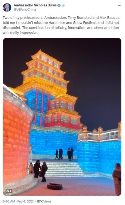 中新網(wǎng)2月4日電 綜合報道,美國駐華大使伯恩斯4日在社交媒體上發(fā)文曬圖,證實自己去了哈爾濱冰雪大世界,并稱贊其是“藝術(shù)、創(chuàng)新和絕對雄心的結(jié)合”,“真正令人折服”。