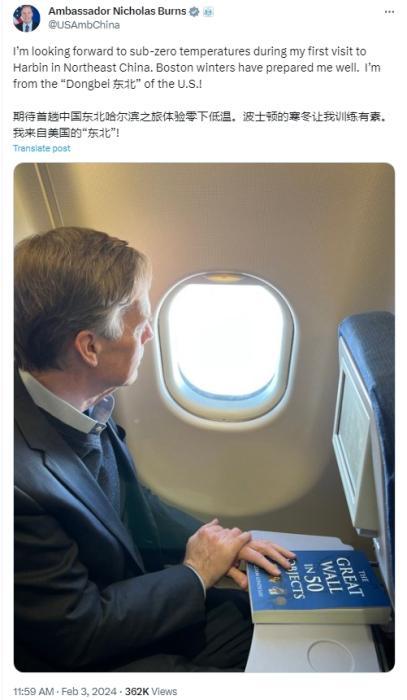 據(jù)報道,伯恩斯3日曾發(fā)文稱,“期待首趟中國東北哈爾濱之旅,體驗零下低溫。波士頓的寒冬讓我訓(xùn)練有素。我來自美國的‘東北’!”