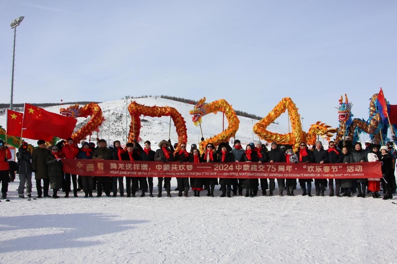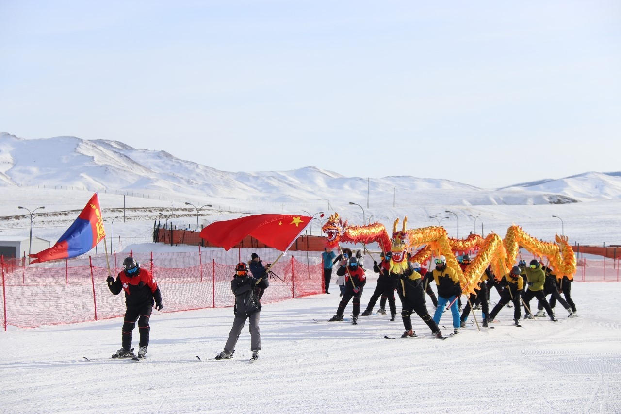 活動首先在位于烏蘭巴托市區(qū)東南的滑雪場展開。35名蒙古國滑雪運(yùn)動員在4面中蒙國旗的引領(lǐng)下,迎著凜冽的北風(fēng),從幾十米高的山頂,托舉綠色、紅色、銀色、金色、藍(lán)色5條巨龍分別從兩條雪道徐徐滑下,寓意龍瑞天降,拉開了慶祝中蒙建交75周年“歡樂春節(jié)”系列活動的序幕。