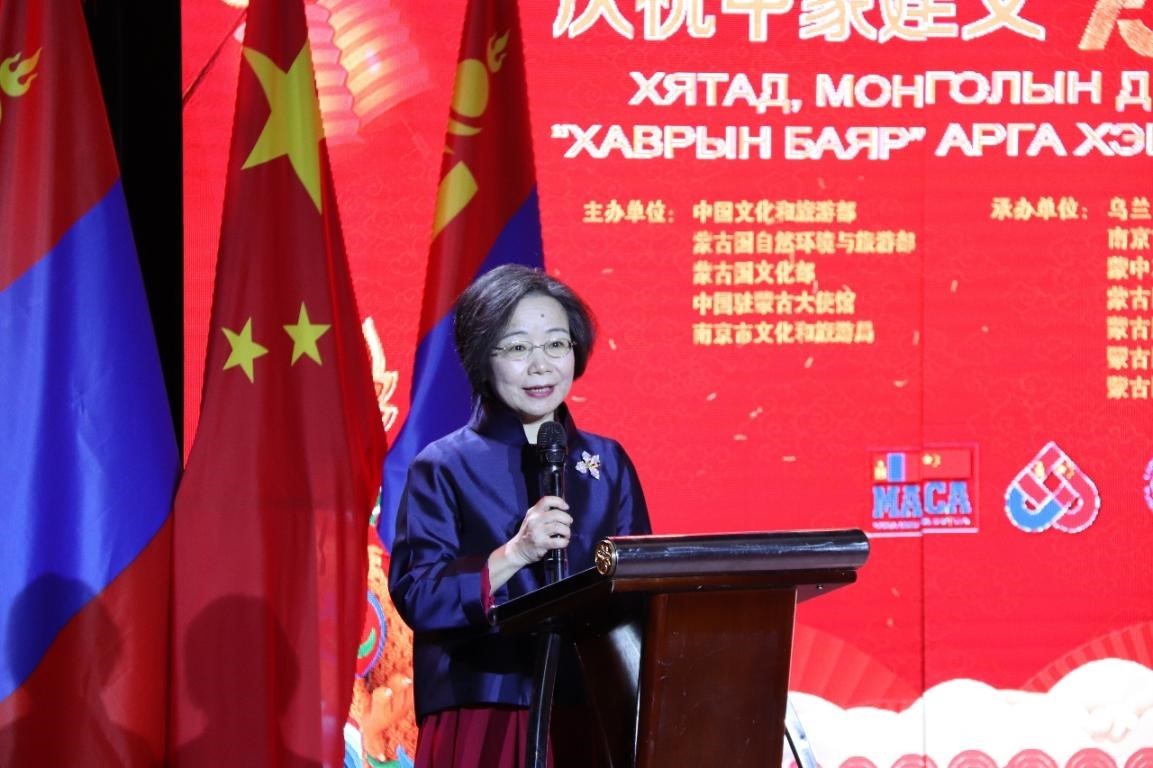 沈敏娟在開幕式致辭中表示,去年底春節(jié)被確定為聯(lián)合國假日,中蒙都有慶祝春節(jié)傳統(tǒng),今年中國春節(jié)和蒙古白月節(jié)恰好又落在同一天,兩國人民將“天涯共此時(shí)”。今年是新中國成立75周年,也是中蒙建交75周年,意義重大。我們要繼往開來,相互支持,相互成就,夯實(shí)兩國命運(yùn)共同體根基,使中蒙關(guān)系持續(xù)走在時(shí)代前列;深化發(fā)展戰(zhàn)略對接,將互補(bǔ)優(yōu)勢更好更快地轉(zhuǎn)化為合作紅利;共同倡導(dǎo)平等有序的世界多極化、普惠包容的經(jīng)濟(jì)全球化,促進(jìn)地區(qū)和全球的公平公正、和平發(fā)展。
