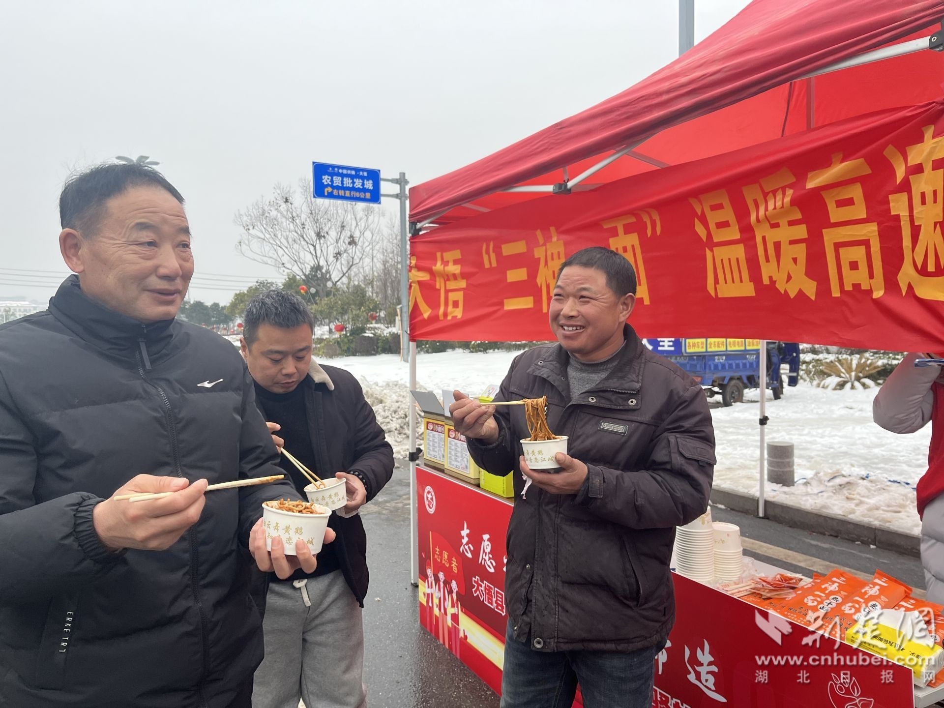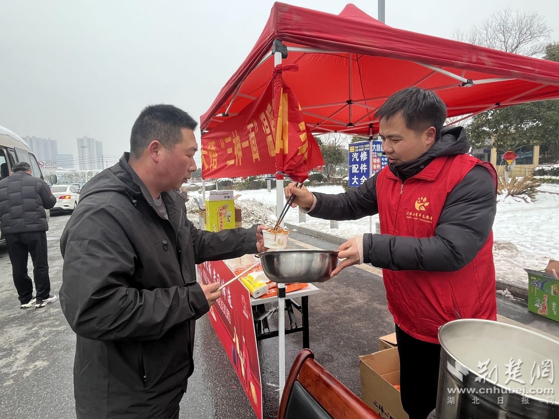熊文文開上面包車,帶上自己廠里生產(chǎn)的熱干面、煤氣壇子、純凈水,在京港澳高速芳畈鎮(zhèn)徐樓段成立志愿服務(wù)驛站,現(xiàn)場煮熱干面,一碗碗熱氣騰騰的熱干面送到寒風中的司機手中。每天,熊文文的志愿服務(wù)驛站排起了吃熱干面的長隊,一天下來,免費為200多名司機免費送去熱干面。