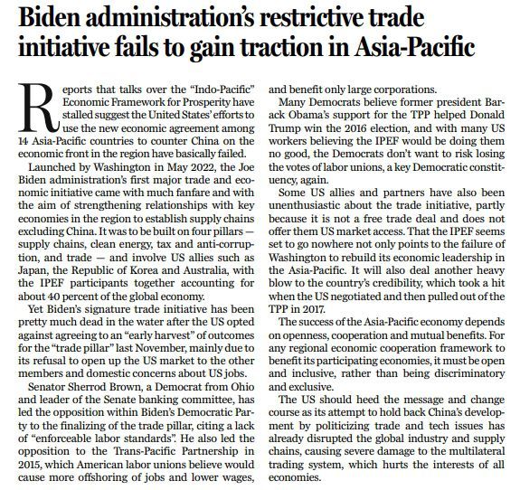 如今美國(guó)的一些盟友及伙伴也開始對(duì)IPEF失去了熱情,部分原因在于該框架并非自由貿(mào)易協(xié)定,也沒(méi)有提供給他們進(jìn)入美國(guó)市場(chǎng)的機(jī)會(huì)。IPEF似乎已經(jīng)是“窮途末路”,它的處境,映證的是美國(guó)在重塑亞太地區(qū)經(jīng)濟(jì)領(lǐng)導(dǎo)力方面的失敗,也令美國(guó)自2017年退出TPP后再次“信譽(yù)掃地”。