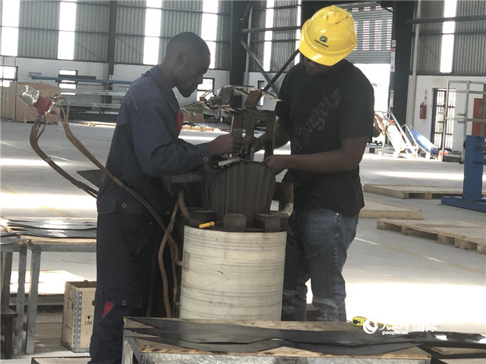 經(jīng)貿(mào)合作區(qū)廠房?jī)?nèi),當(dāng)?shù)毓と苏诰o張作業(yè)。人民網(wǎng)記者 黃培昭攝