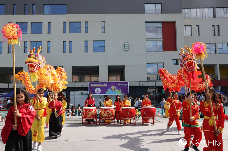 | 圖為迪拜尚瑪科國際學(xué)校學(xué)生展示舞龍表演。人民網(wǎng)記者 張志文攝 |