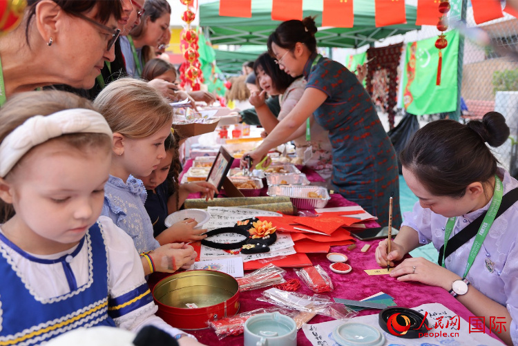 成立儀式上,由該校學(xué)生展示的舞龍表演贏得陣陣掌聲。而在一旁的中國文化展臺充滿“年味兒”,書法作品和小吃美食等備受各國師生家長青睞。
