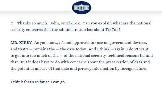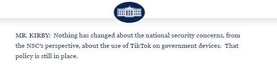 柯比表示,從國(guó)家安全委員會(huì)的角度來(lái)看,“對(duì)在政府設(shè)備上使用TikTok的國(guó)家安全擔(dān)憂沒有改變,這一政策仍然有效?!?/p>