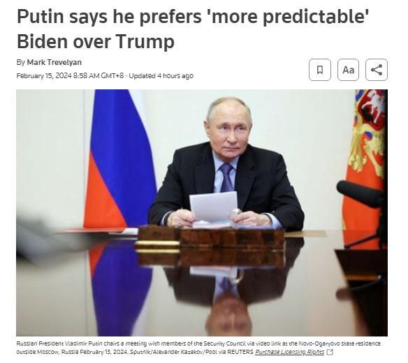 據(jù)報道,這是普京首次公開評論2024年美國大選。當(dāng)被問及兩人誰對俄羅斯“更有利”時,普京回應(yīng):“拜登,他更有經(jīng)驗、更有預(yù)見性,是一位老派政治家。”