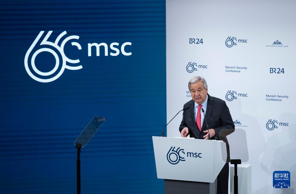 2月16日,在德國(guó)慕尼黑,聯(lián)合國(guó)秘書(shū)長(zhǎng)古特雷斯在第60屆慕尼黑安全會(huì)議(慕安會(huì))開(kāi)幕式上致辭。新華社記者張帆攝