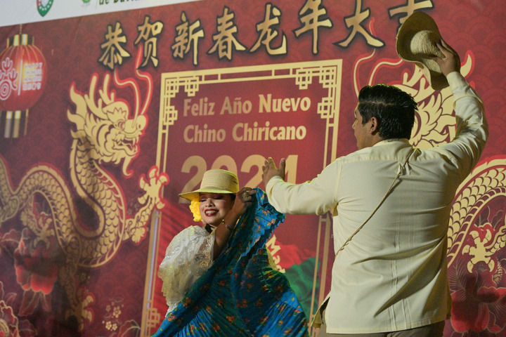 2月17日,在巴拿馬奇里基省首府戴維市,兩名身穿巴拿馬民族服飾的舞者在奇里基春節(jié)慶?;顒?dòng)上表演。新華社記者陳昊佺攝