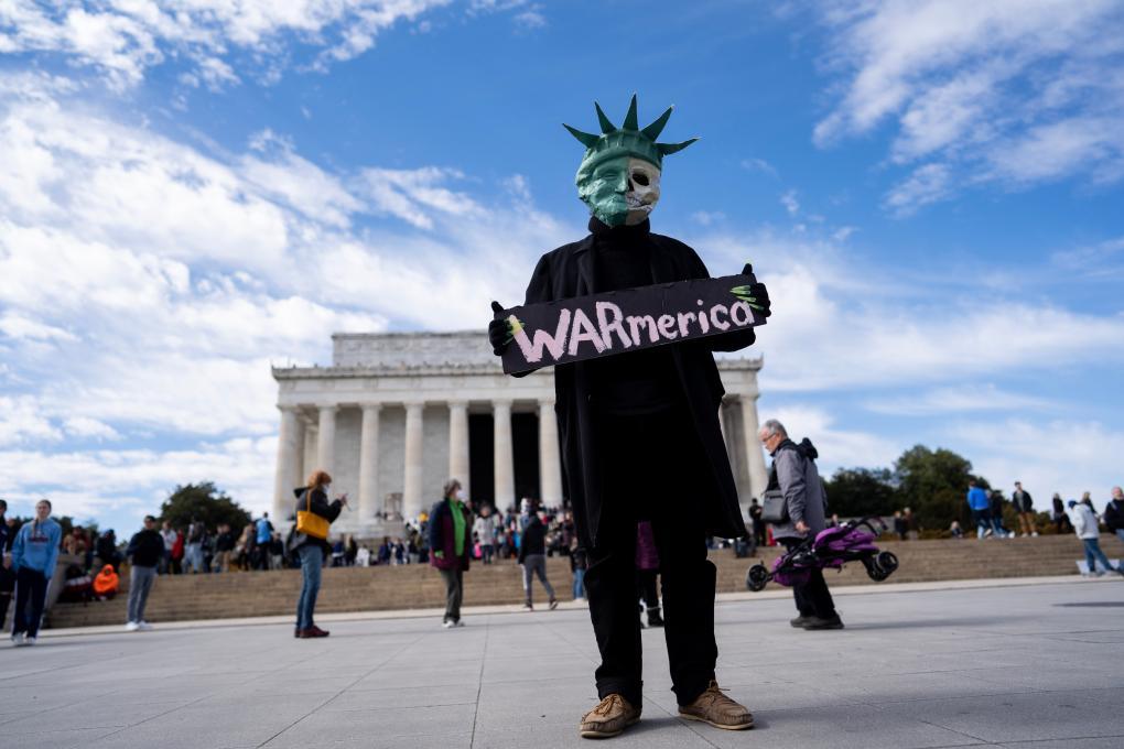 2023年2月19日,在美國首都華盛頓,一名抗議者手舉標語在林肯紀念堂前參加集會。新華社記者劉杰攝