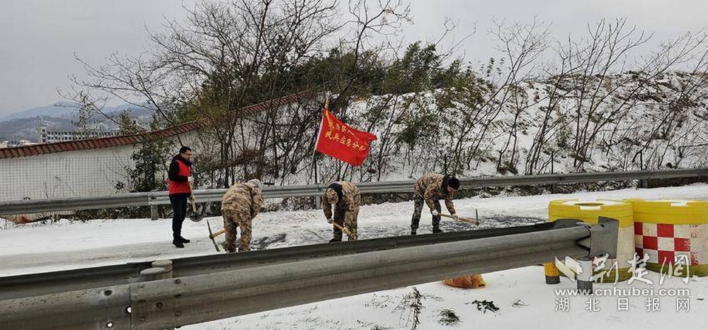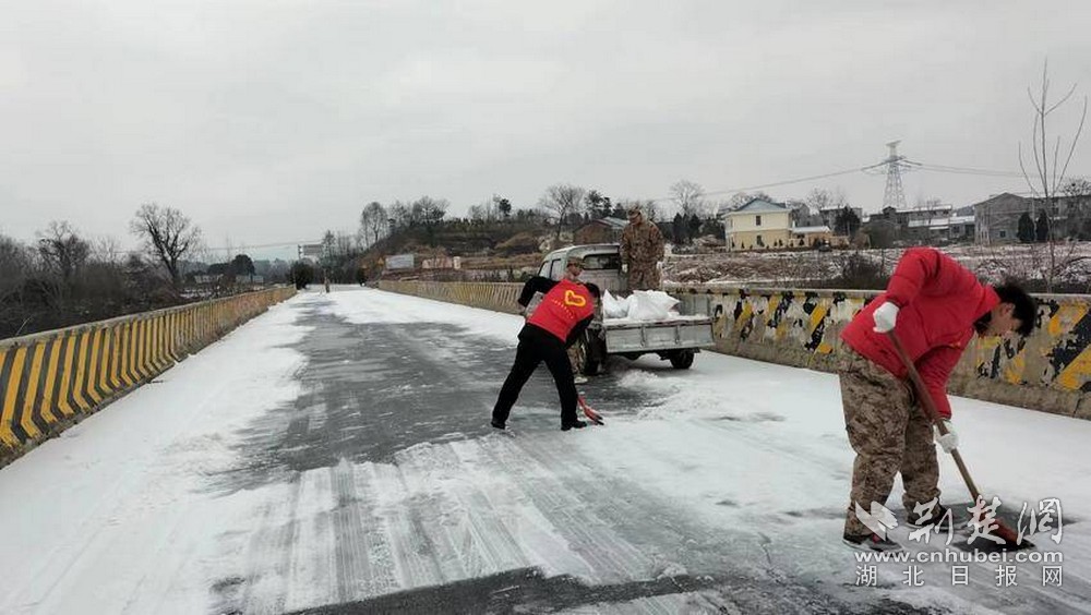 陽平鎮(zhèn)民兵志愿者到京珠高速鏟冰除雪,禮山學校志愿者來到京港澳高速出口除冰雪保暢通??h直單位和鄉(xiāng)鎮(zhèn)區(qū)組織多名志愿者上路、進社區(qū)開展掃雪除冰行動,方便群眾安全出行。