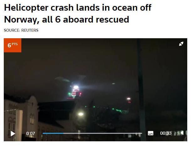 中新網(wǎng)2月29日電 據(jù)路透社報道,當(dāng)?shù)貢r間28日,挪威聯(lián)合救援協(xié)調(diào)中心稱,一架載有6人的直升機在挪威西部海岸附近海域墜毀,機上所有人員隨后被從海中救起。