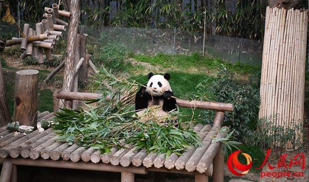 “福寶”享用新鮮的竹子。人民網(wǎng) 李帆攝