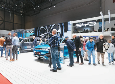 圖為日內瓦國際車展上拍攝的比亞迪展臺。新華社記者 孟鼎博攝
