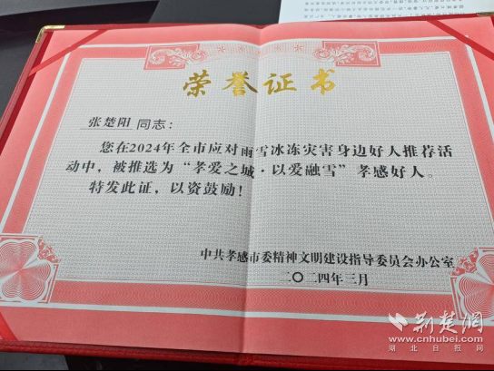 3月1日,孝南區(qū)毛陳鎮(zhèn)龍湖村“00后”大學(xué)生張楚陽因雪中義舉,被授予“孝愛之城·以愛融雪”孝感好人稱號(hào),并現(xiàn)場(chǎng)接受了孝感市政府市長(zhǎng)吳慶華的頒獎(jiǎng)。