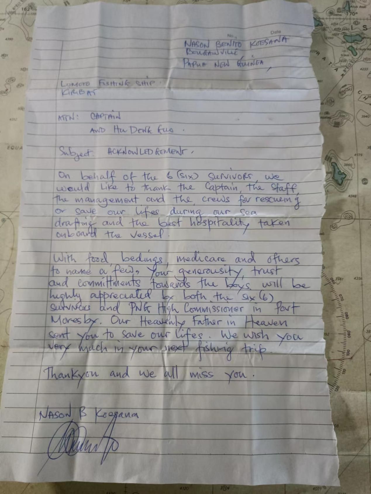 內(nèi)森·本特羅·科埃薩納代表被救的全體6名巴新遇險(xiǎn)人員,專門寫了感謝信,向中國(guó)漁船船長(zhǎng)及船員表示感謝。感謝信寫道:“當(dāng)我們?cè)诤I掀鲿r(shí),船長(zhǎng)和船員拯救了我們的生命,我們?cè)诖鲜艿搅俗詈玫目畲#ㄖ袊?guó)漁船給我們提供了)食物、床上用品、醫(yī)療救助等,我們6名幸存者及莫爾茲比港的巴新高級(jí)專員都高度贊賞你們對(duì)我們的慷慨、信任和奉獻(xiàn)?!?/p>
