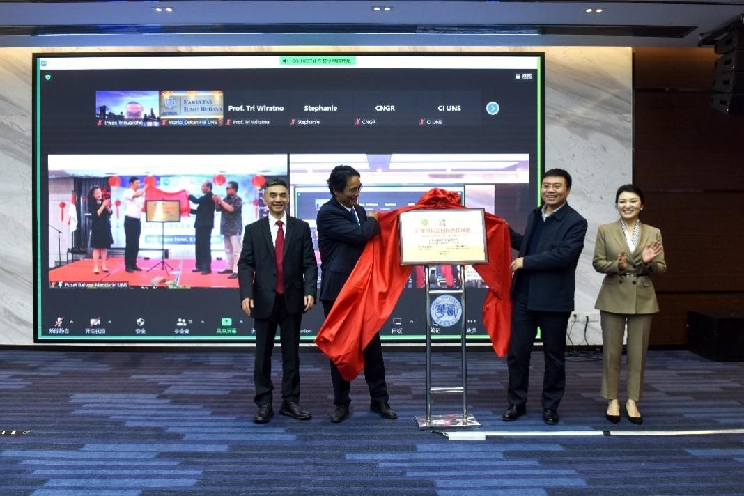 合作方代表為“產(chǎn)學(xué)研校企國際合作基地”揭牌。印尼三一一大學(xué)孔子學(xué)院供圖