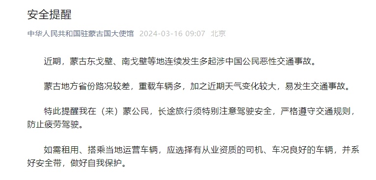 央視網(wǎng)消息:中國駐蒙古國大使館日前發(fā)布安全提醒。
