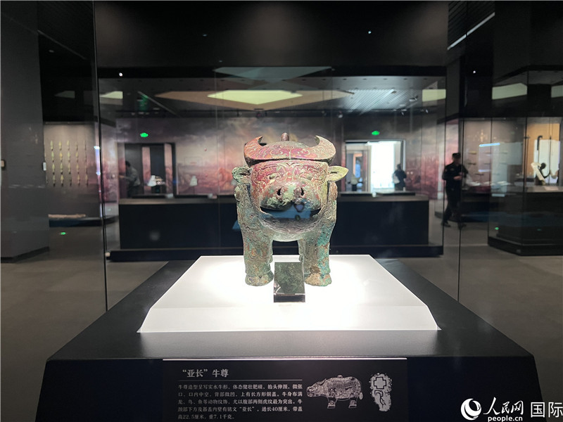 殷墟博物館新館展出的“亞長”牛尊。人民網(wǎng)記者 崔越攝