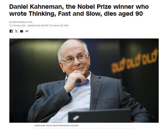 中新網(wǎng)3月28日電 據(jù)美國有線電視新聞網(wǎng)(CNN)報道,當?shù)貢r間27日,以色列裔美國認知心理學家、諾貝爾經(jīng)濟學獎得主丹尼爾·卡尼曼(Daniel Kahneman)去世,享年90歲。