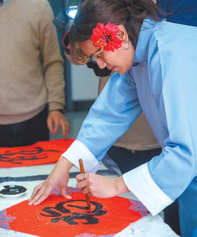 安雅在學(xué)校為留學(xué)生舉辦的新春活動上用毛筆書寫“福”字。受訪者供圖