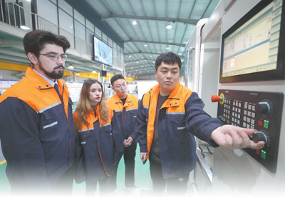 沈陽工學(xué)院與武漢華中數(shù)控股份有限公司共同建設(shè)“一帶一路”訂單班,聯(lián)合培養(yǎng)行業(yè)急需的“專業(yè)+俄語”高素質(zhì)應(yīng)用型人才,訂單班學(xué)生畢業(yè)后將回國從事數(shù)控技術(shù)相關(guān)工作,實現(xiàn)高質(zhì)量就業(yè)。圖為中國同學(xué)和留學(xué)生分享操作經(jīng)驗。新華社記者 楊 青攝