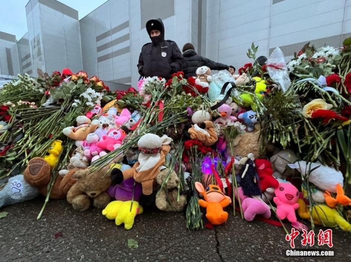 當(dāng)?shù)貢r(shí)間3月24日,俄羅斯全國(guó)哀悼日,悼念22日發(fā)生在莫斯科州克拉斯諾戈?duì)査箍耸小翱肆_庫(kù)斯城”音樂(lè)廳恐怖襲擊事件中的遇難者。圖為民眾在恐襲事件現(xiàn)場(chǎng)附近敬獻(xiàn)的鮮花和毛絨玩具。中新社記者 田冰 攝