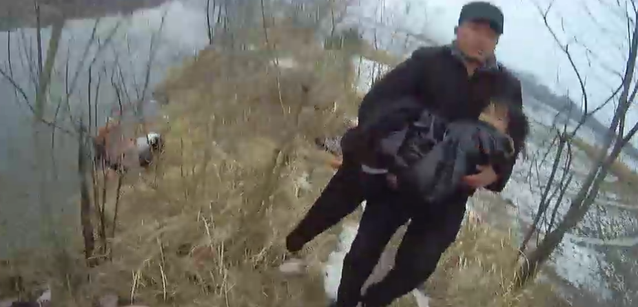 隨后趕到現(xiàn)場(chǎng)的民警江國(guó)棟,將落水婦女和體力透支的武慶濤拉回岸邊。