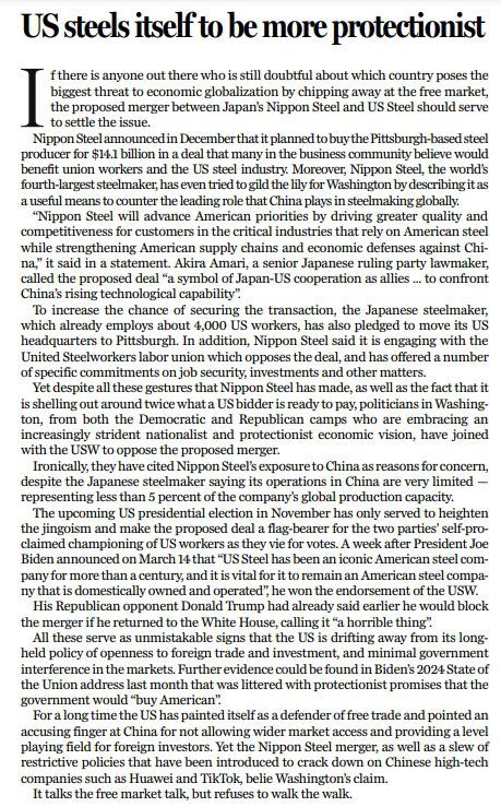 諷刺的是,美國政客們更以新日鐵在中國的業(yè)務(wù)為由,對這項收購提出了所謂的“關(guān)切”——盡管新日鐵宣稱,其在華業(yè)務(wù)范圍有限,且產(chǎn)能只占其公司全球產(chǎn)能的不到5%。