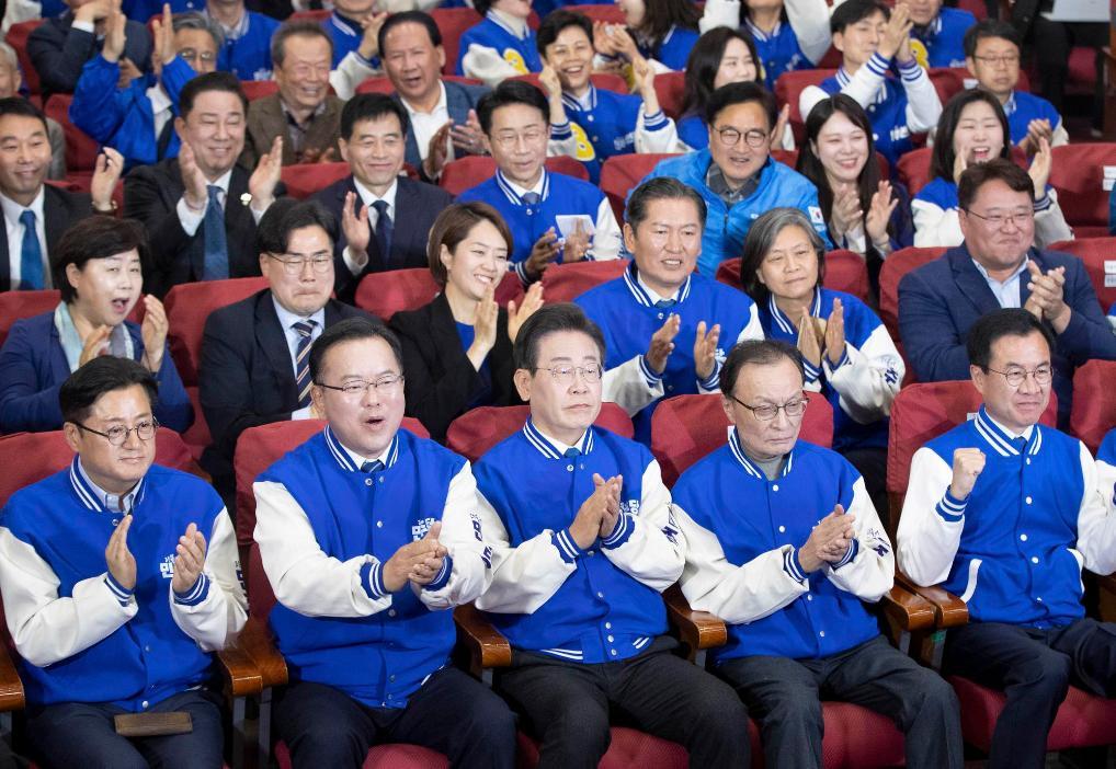 4月10日,在韓國首爾,韓國最大在野黨共同民主黨黨首李在明(前排中)與共同民主黨領(lǐng)導(dǎo)層共同慶祝出口民調(diào)結(jié)果大幅領(lǐng)先。新華社記者姚琪琳攝