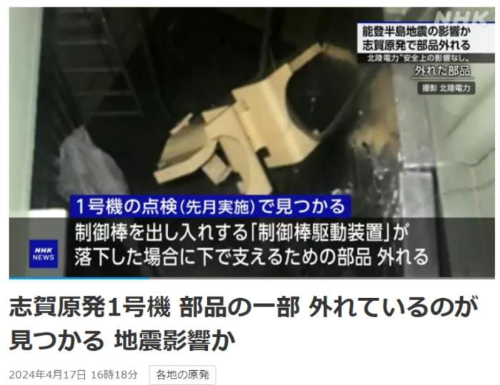中新網(wǎng)4月19日電 據(jù)日本廣播協(xié)會(NHK)報道,日本北陸電力公司4月17日表示,位于石川縣的志賀核電站一個關(guān)鍵部件在1月1日的能登半島7.6級地震后掉落。