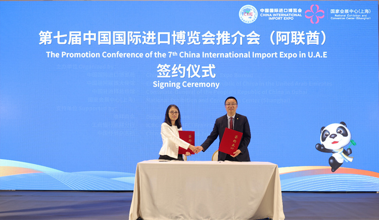 中國(guó)國(guó)際進(jìn)口博覽局與阿聯(lián)酋中國(guó)商會(huì)簽署合作備忘錄。中國(guó)國(guó)際進(jìn)口博覽局供圖