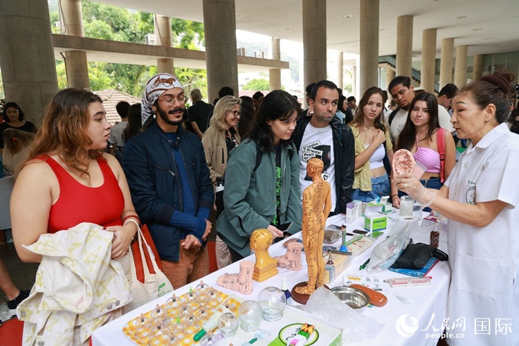 最后,文化體驗(yàn)活動(dòng)正式開(kāi)始。展臺(tái)前人頭攢動(dòng),巴西師生紛紛參與其中,體驗(yàn)中國(guó)書(shū)法,品鑒中國(guó)茶,體驗(yàn)中醫(yī)按摩和針灸,咨詢(xún)中資企業(yè)招聘,并品嘗中國(guó)美食等。