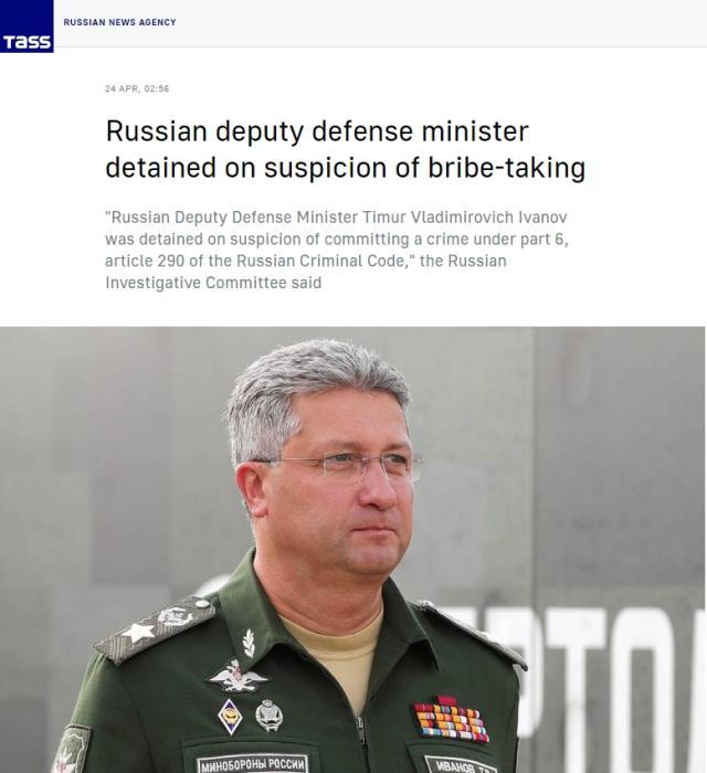 中新網(wǎng)4月24日電 據(jù)塔斯社報(bào)道,俄羅斯偵查委員會(huì)當(dāng)?shù)貢r(shí)間23日表示,俄國防部副部長鐵木爾·伊萬諾夫因涉嫌受賄被拘留。