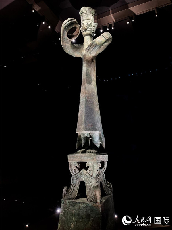 三星堆博物館展出的青銅大立人像。人民網(wǎng)記者 羨江楠攝