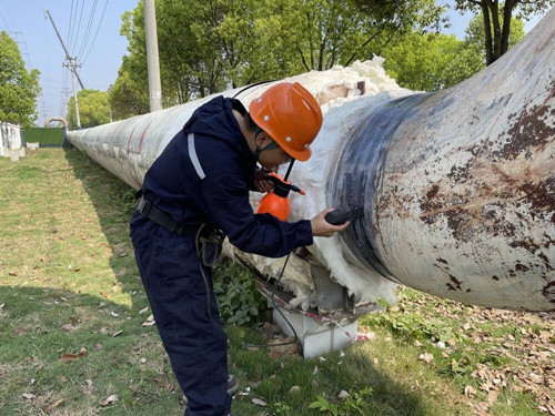 檢驗現(xiàn)場,宜昌分院兵分三組進行檢驗,對壓力管道的標志、組成件及焊縫、管道支撐件、排放裝置、防腐層及隔熱層外觀情況進行了檢驗,查看了安全閥和壓力表是否在損壞情況,還按要求對重點部位進行了壁厚測量、金相分析、無損檢測。因準備充分,檢驗人員當天便完成了全線管道現(xiàn)場檢驗任務,獲得企業(yè)點贊。