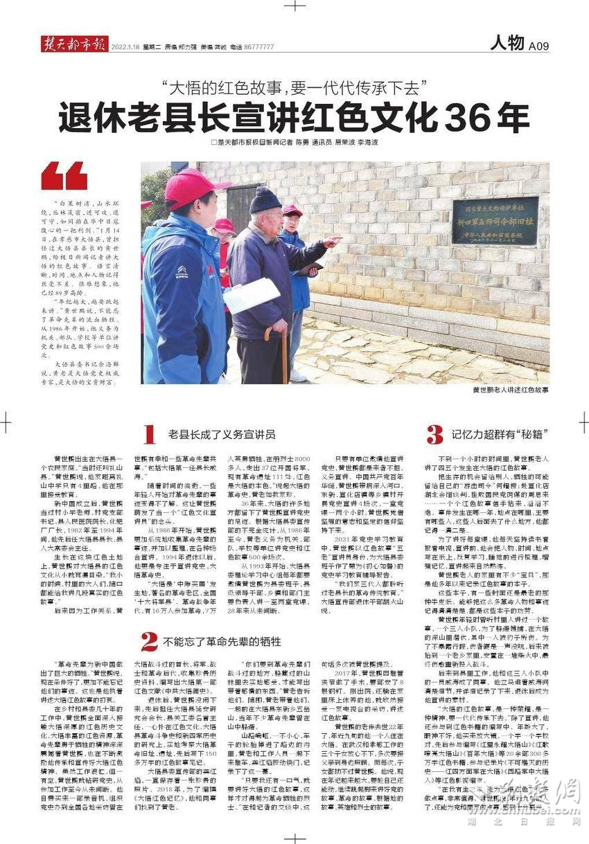 從1986年開始,無論是在工作崗位上,還是退休后,只要有機(jī)會(huì),黃世鵬就向干群講述大悟革命故事和紅色歷史,傳承紅色基因,這一講就是38年。