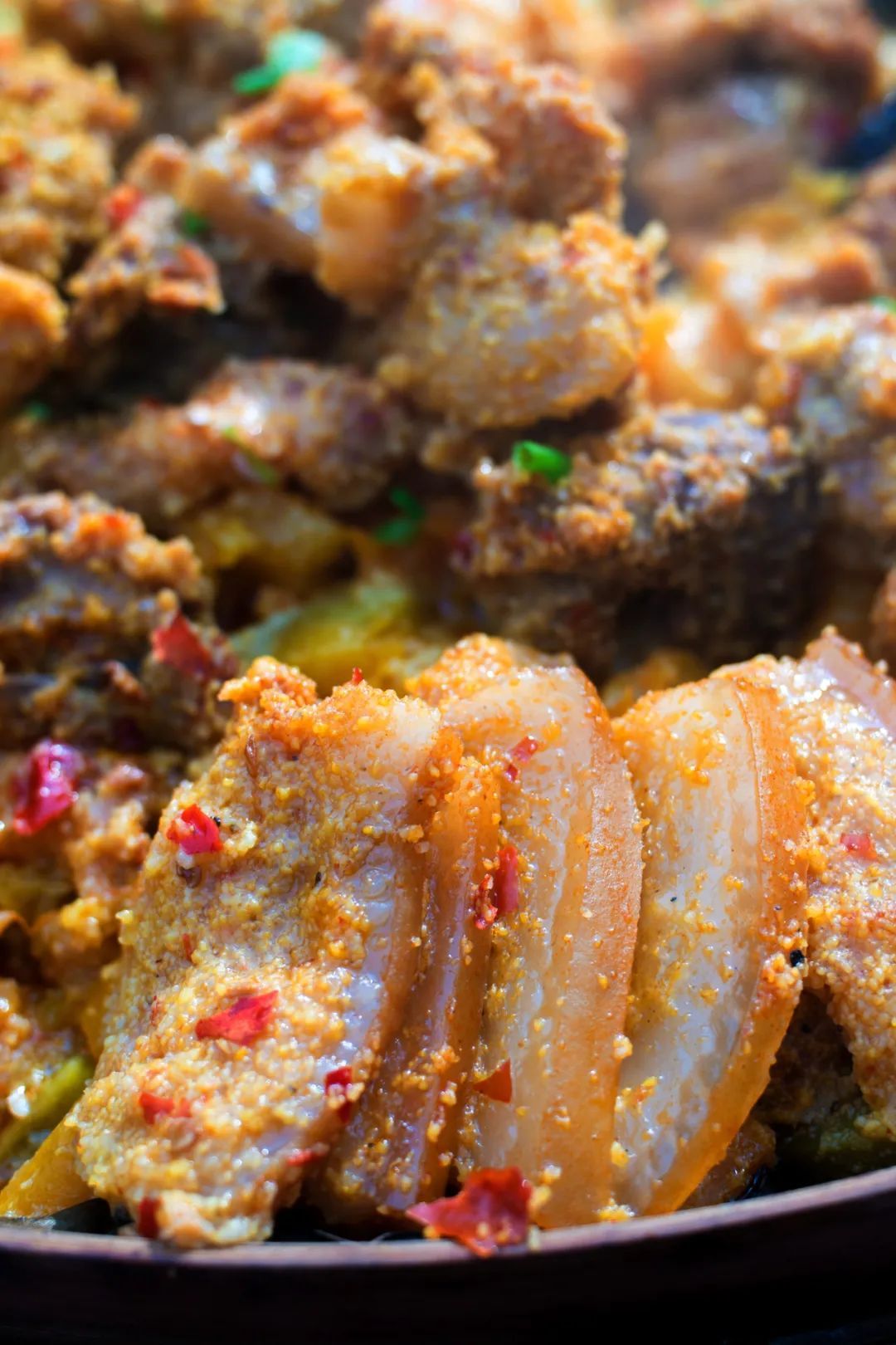 味道奇特的榨廣椒蒸肉。 攝影/讓龍,圖/圖蟲·創(chuàng)意當然,最普遍的還是用豬肉、土豆和恩施特有的榨廣椒制作的格格。出鍋以后油而不膩、醇香松軟、又香又辣,令人回味無窮。