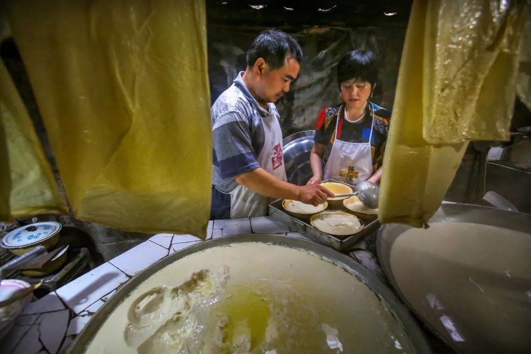 傳承著恩施傳統(tǒng)美食的手藝人,圖1為豆皮制作過程,圖二為油茶湯。
