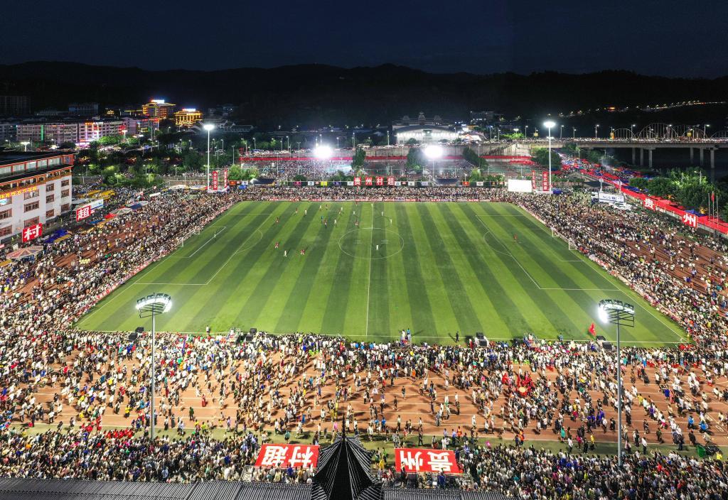 2023年7月1日,人們?cè)谟^看貴州“村超”足球賽(無人機(jī)照片)。新華社記者楊文斌攝