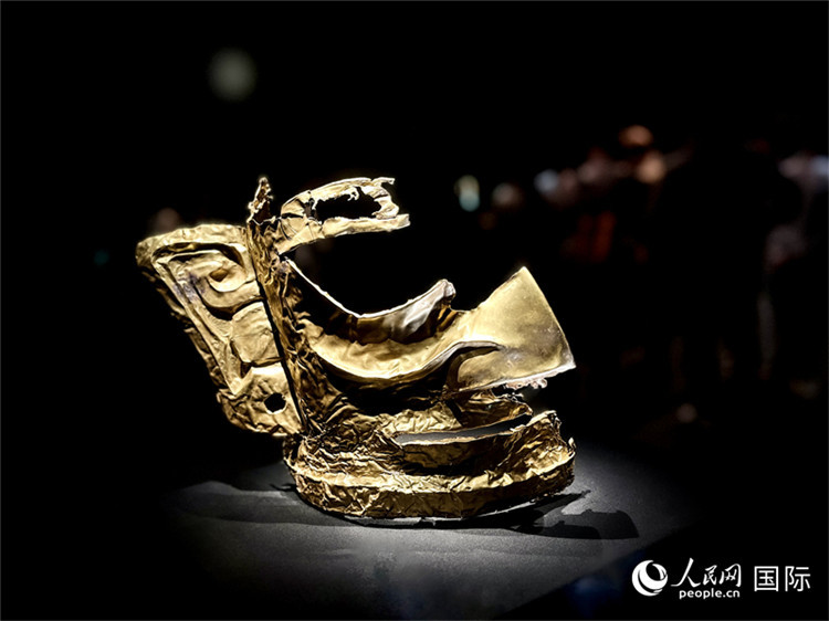 三星堆博物館中展出的黃金金面具。人民網(wǎng)記者 羨江楠攝