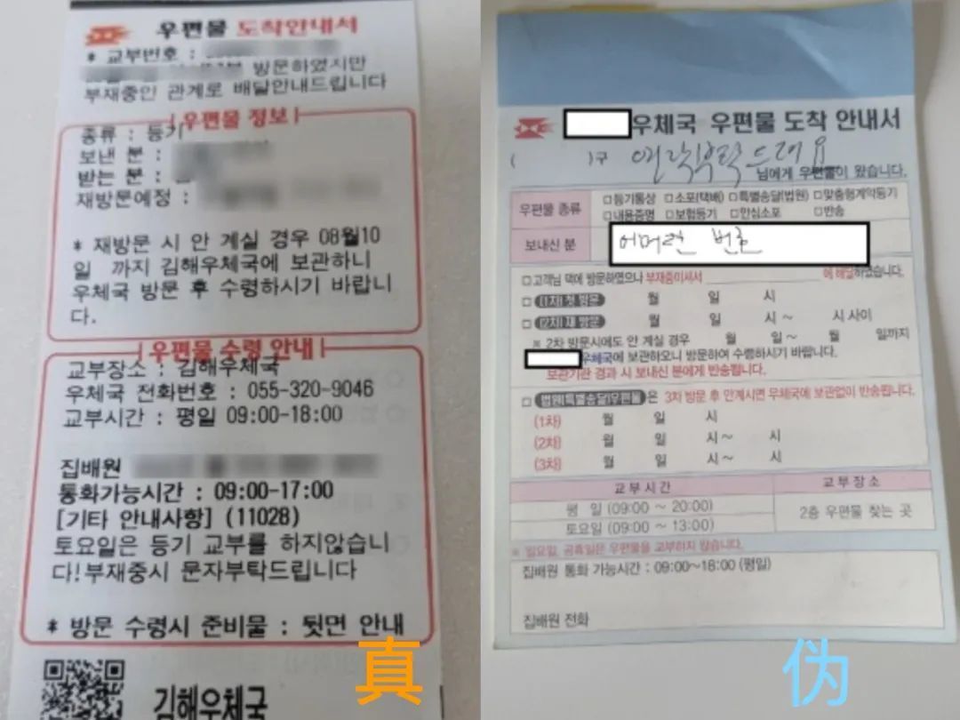 據(jù)韓國(guó)警察廳公告,近日韓國(guó)出現(xiàn)利用掛號(hào)信的新型電信詐騙形式“ ”(Letter Phishing)。詐騙分子用偽造的掛號(hào)信郵單誘導(dǎo)受害者通話,謊稱郵政或執(zhí)法機(jī)構(gòu)索要個(gè)人信息實(shí)施詐騙。