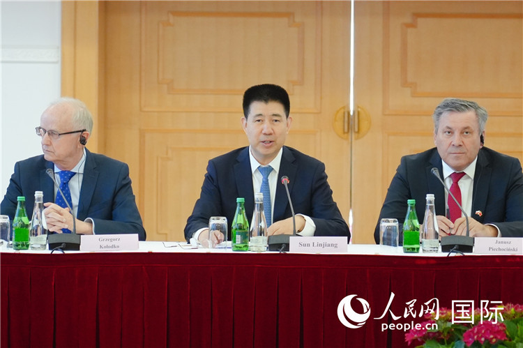 圖為中國駐波蘭大使孫霖江(中)在座談會上作主旨發(fā)言。人民網(wǎng)記者 李增偉攝