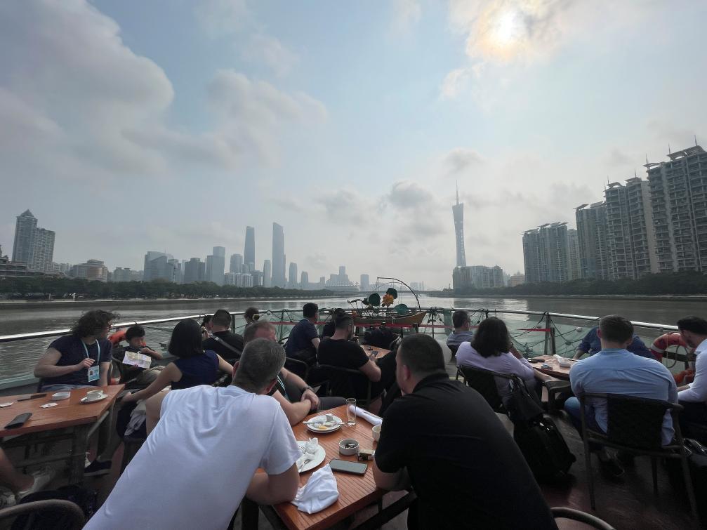 4月15日,采購商從入住的白天鵝賓館乘坐定制接駁交通船前往第135屆廣交會場館。新華社記者霍思穎攝